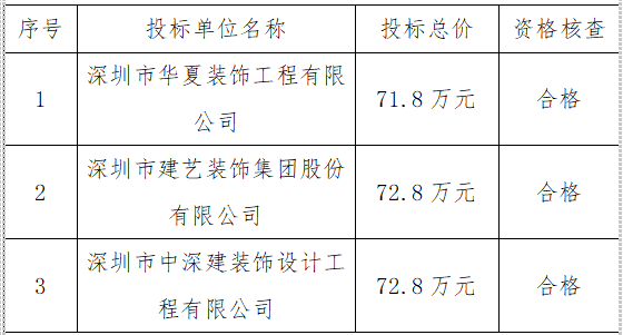 自由港湾B栋升级改造设计服务项目于2018年8月7日在深圳市国际招标有限公司官网和中国招标投标公共服务平台上登载了第二次招标公告进行公开招标,招标控制价为75万元。在投标截止时间2018年8月28日内共有3家单位递交了投标文件。经评标委员会根据招标文件既定评标办法(评定分离)评议,定标委员会根据评标报告、投标人投标报价、述标情况进行集体议事法定标。现中标结果已经报集团招投标领导小组确认,特此公示如下: