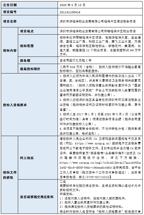 深圳市乐鱼物业发展有限公司福保片区清洁服务项目招标公告