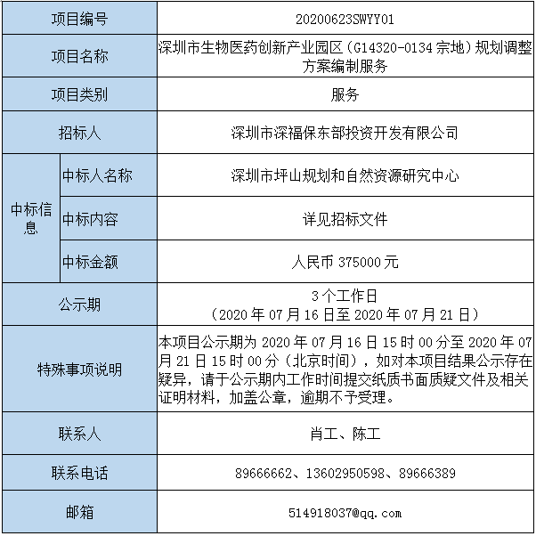 深圳市生物医药创新产业园区(G14320-0134宗地)规划调整方案编制服务项目邀请招标评标结果已完成,现将本项目评审的相关情况及结果进行公示,具体内容如下: