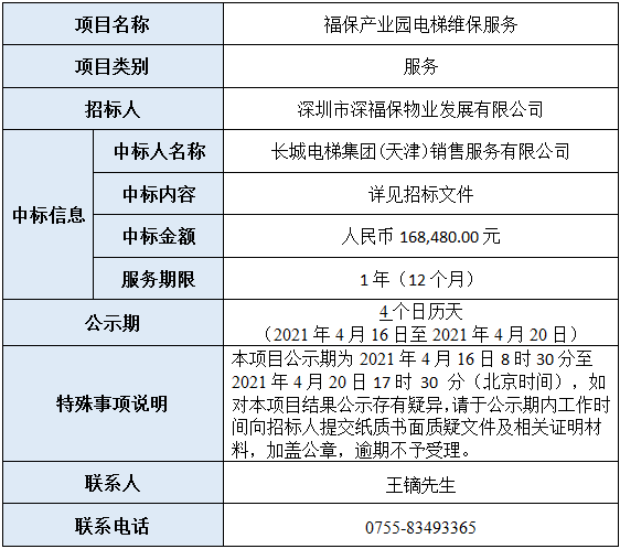 福保产业园电梯维保服务(深圳市建设工程材料设备询价采购网络服务平台招标编号:SZXJCG-S202103100011)已完成评审,现将本项目评审的相关情况及结果进行公示,具体内容如下: