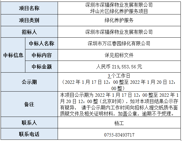 深圳市乐鱼物业发展有限公司坪山片区绿化养护服务项目已完成评审,现将本项目评审的相关情况及结果进行公示,具体内容如下:
