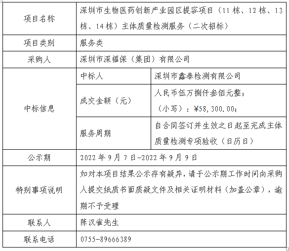 深圳市生物医药创新产业园区提容项目(11栋、12栋、13栋、14栋)主体质量检测服务(二次招标)中标结果公示