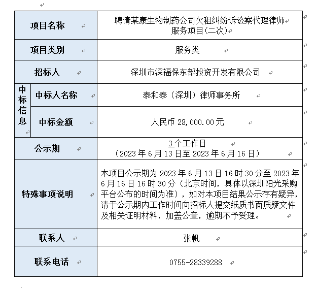 聘请某康生物制药公司欠租纠纷诉讼案代理律师服务项目(二次)已完成评审,现将本项目评审的相关情况及结果进行公示,具体内容如下: