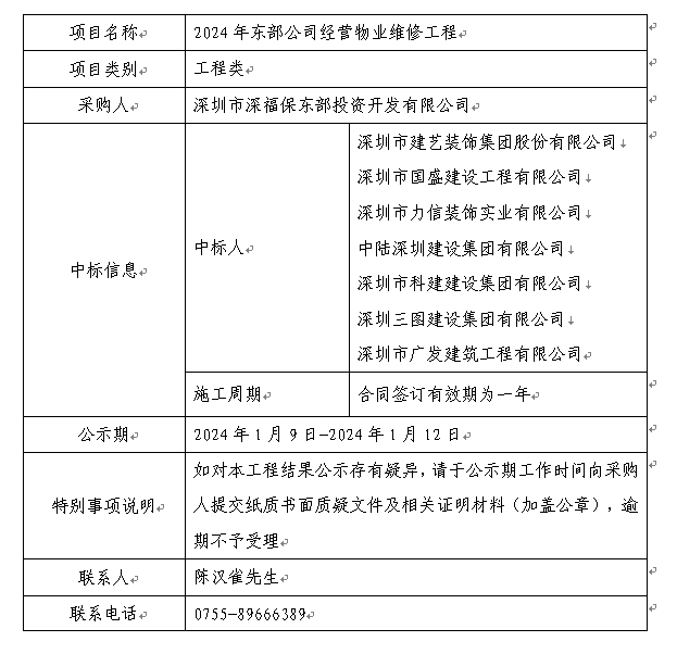 在深圳阳光采购平台进行公开招标的2024年东部公司经营物业维修工程已完成评审及定标,现将本工程评审的相关情况及定标结果进行公示,具体内容如下: