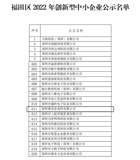 【喜讯】创新中心入驻企业-深圳赛美思高科有限公司通过“福田区2022年创新型中小企业”评价认定