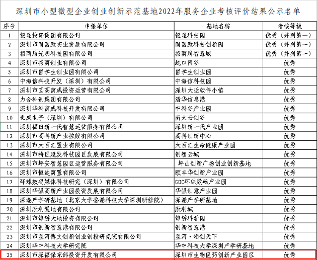 生物园于近日成功获评深圳市小型微型企业创业创新示范基地2022年服务企业考核“优秀”等级,再次展现园区优质的企业服务、运营管理水平。